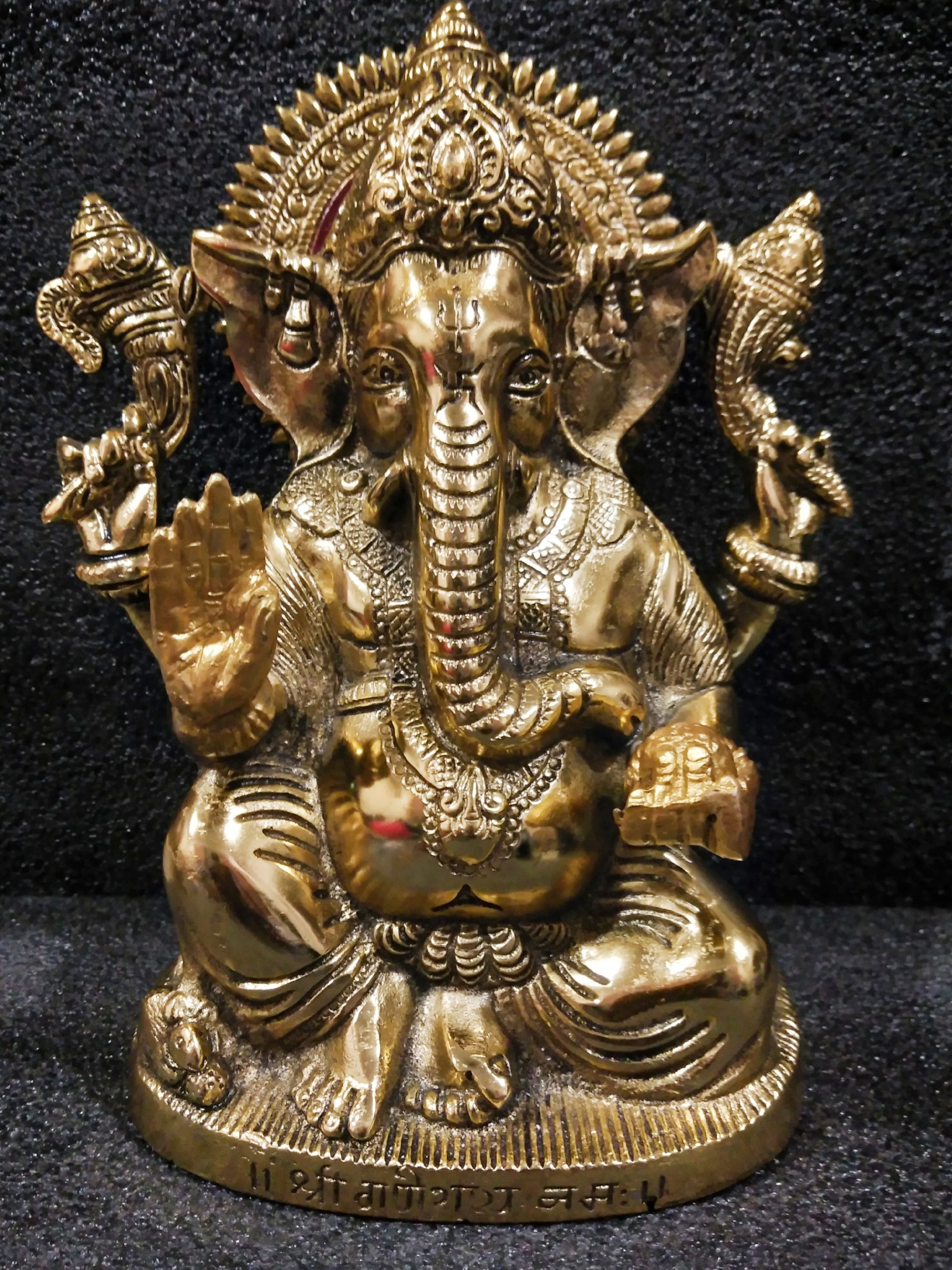 Lord ganesha Moorti is made of metal in yellow color. Hindu god ganesh alias ganapathi is revered as the remover of obstacles and the deva of intellect and wisdom. Lord ganesha is generally called as the lord of beginnings. He is honored at the beginning of rituals and ceremonies. Lord ganesha figurine is for religious/ spiritual and home decoration purposes. Metal Ganesha deity is an excellent show piece and can be placed in puja altar, work desk, table. Ganesh sculpture can be gifted to your friends in all special occasions. This ganesh statue is a superb idol for home decor The big size god icon is an excellent show piece and decor of rajasthani handicraft. Hindu god ganesha statue can be placed in puja room. Bagavan Ganesh can be given to friends and relatives as spiritual decor, good luck gift, feng shui vastu gift on house warming, marriage and all festivals especially on Ganesh chathurti. About metal ganesh statue: Material: Lord ganesh murti is made of metal The hindu god ganesha idol in metal is of big size. Length 17 cm, Width 11 cm, Height 21 cm; Weight 1185 grams. Metal Ganesha statue for home decor deity is an excellent showpiece decor and can be placed in puja altar, work desk, table. Ganesh sculpture in metal can be gifted to your friends in all special occasions. This ganesh statue is a superb idol for home decor in metal. Hindu god Metal ganesha statue can be placed in puja room. Bagavan Ganesh can be given to friends and relatives as spiritual decor, good luck gift, feng shui vastu gift on house warming, marriage and all festivals especially on Ganesh chathurti. This god icon is an excellent show piece and decor of rajasthani handicraft.