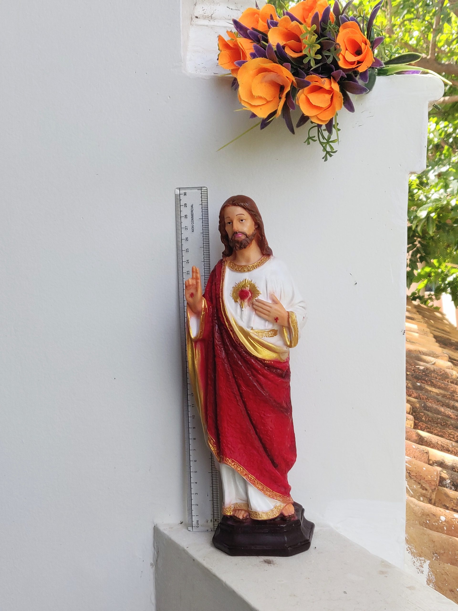 Sacred heart Jesus statue for home decor is big size with height 30 cm, length measures 8cm and width measures 7.5 cm. Jesus figurine for home altar weight is 177 grams. As jesus murti for table is light in weight it is easy to handle.